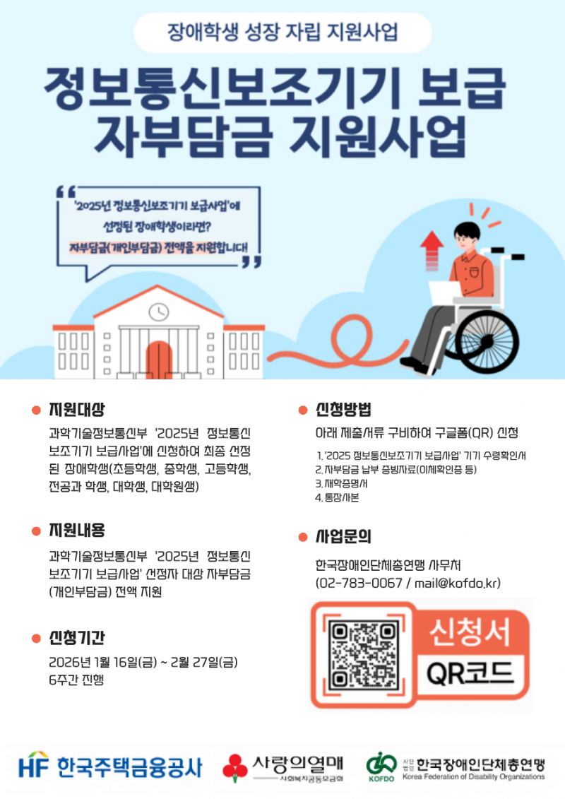 한국장애인단체총연맹(이하 한국장총)이 한국주택금융공사, 사회복지공동모금회와 함께 ‘장애학생 성장 자립 지원사업(정보통신보조기기 보급 자부담금 지원사업)’대상자를 오는 2월 27일까지 모집한다.