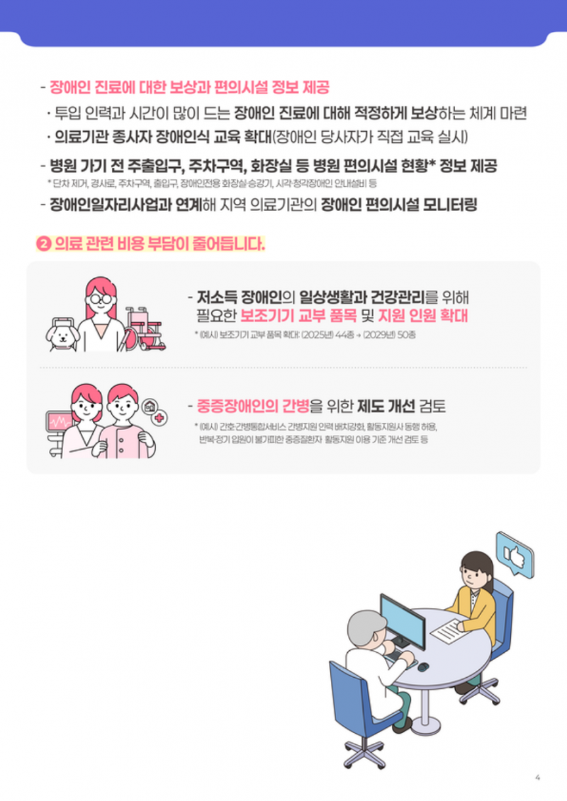 중증장애인 입원 시 간병 지원을 위해 간호·간병통합서비스 간병지원인력 배치 강화, 활동지원사 동행 허용 등을 검토하고, 반복·정기적 입원이 불가피한 장애인의 활동지원 이용 기준 개선도 검토한다. 저소득 장애인을 위한 보조기기 교부도 지원대상과 품목을 점차 확대해 나간다.