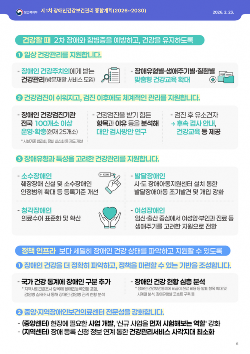 정부가 23일 제27차 장애인정책조정위원회 심의·의결을 거쳐 “장애인 누구나 건강하고 행복한 삶 실현”을 목표로 하는 ‘제1차 장애인 건강보건관리 종합계획(2026~2030)’을 확정·발표했다.