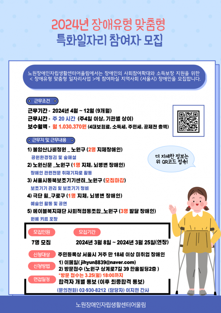 ** 2024년 장애유형 맞춤형 특화일자리에 관심있는 지역사회(서울시) 장애인분들의 많은 참여와 관심 부탁드립니다**