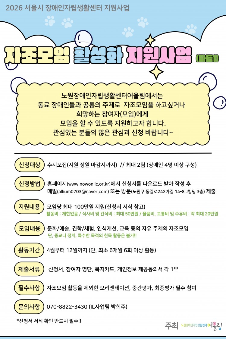 2026년 서울시장애인자립생활센터 지원사업의 일환으로 '자조모임 활성화 지원사업(파트1)'을