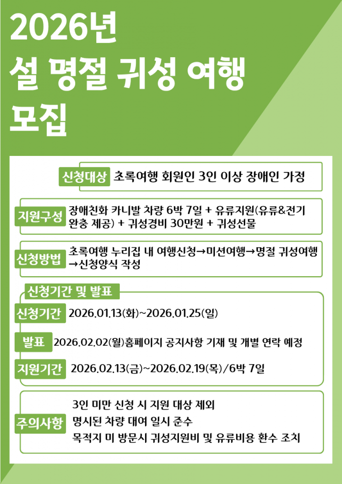 기아 초록여행에서 3인 이상 장애인 가족(초록여행 회원한정) 대상으로 설 명절 귀성여행 지원을 실시한다는 정보가 있어 공유해드립니다.