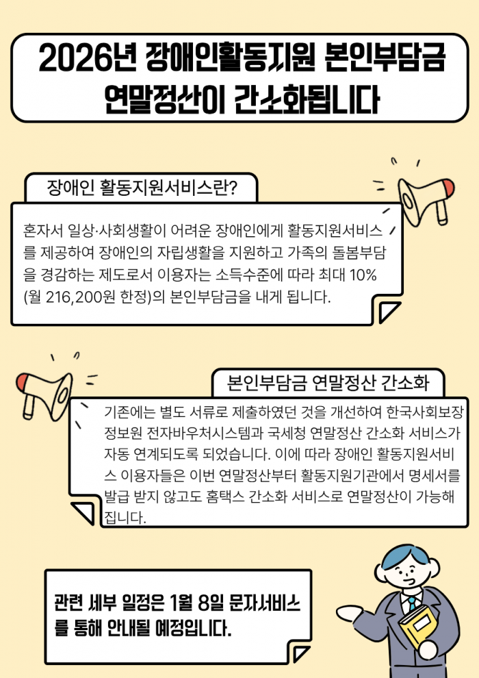 이에 따라 장애인 활동지원서비스 이용자들은 이번 연말정산부터 활동지원기관에서 명세서를 발급받지 않고도 홈택스 간소화 서비스로 연말정산이 가능해진다. 세부 일정은 1월 8일 문자서비스를 통해 안내될 예정이다.