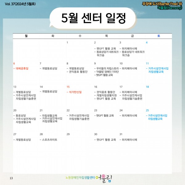 노원장애인자립생활센터어울림 5월 웹진 페이지 정보 작성자 노원IL어울림 작성일24-05-10 18:08 조회4,111회 댓글0건 관련링크 본문 노원장애인자립생활센터어울림 5월 웹진 → https://url.kr/pci3rl 댓글목록 등록된 댓글이 없습니다. 다음글 이전글 목록
